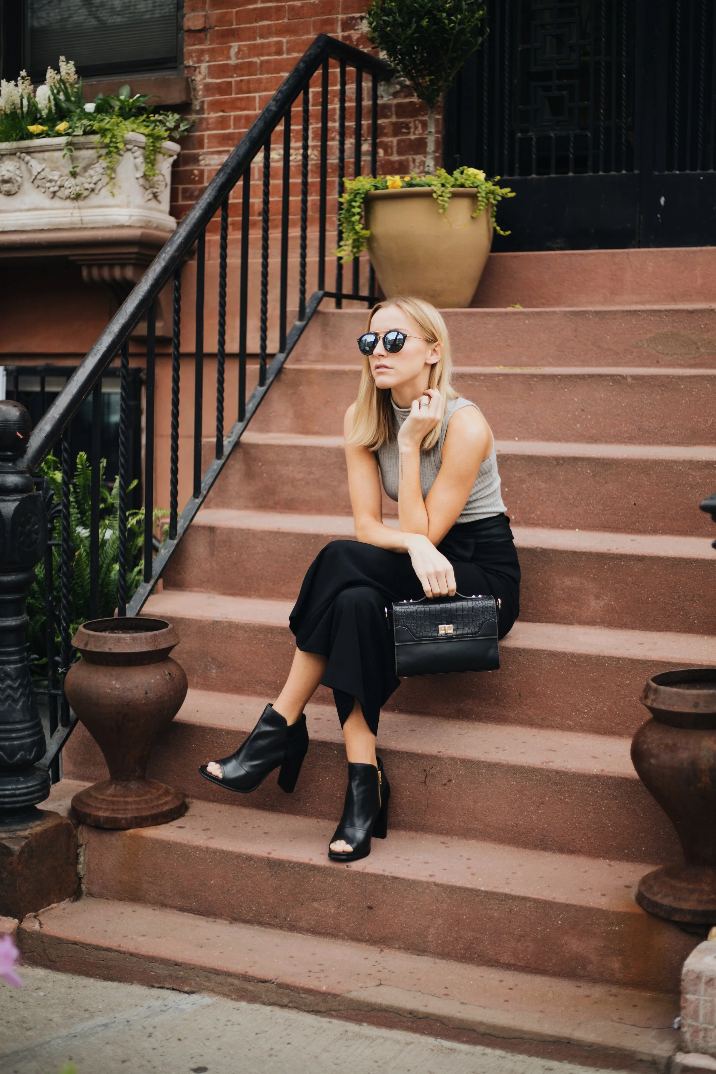 With the right accessories, you can easily turn any basic look into something more fun + exciting! Comfort is super important to me when choosing what to wear everyday, so basics tend to take the lead. I'm also a sucker for an outfit that can easily transition from day to night! When your day is spent running around NYC from uptown to downtown for work + meetings, going home to Brooklyn before dinner is often times out of the question. A change in accessories can make this day-to-night transition super easy! For this look in particular, I wore a gray mock neck tank and black wide leg pants from Zara. To make my outfit more special and more of a night look, I added some of my favorite accessories-- a vintage silk belt, M4D3 peep-toe booties, my Kapten & Son sunglasses, and my new COCOVANN handbag!